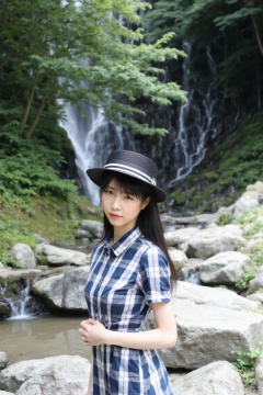 1girl, solo, long hair, looking at viewer, shirt, black hair, hat, dress, short sleeves, outdoors, day, striped, water, black eyes, tree, plaid, realistic, plaid shirt, photo background, plaid dress