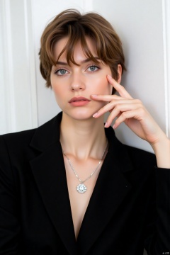 a young woman with short brown hair and blue eyes is wearing a black blazer. Her left hand is resting on her chin