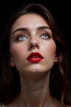and her hair is long and cascades down to her shoulders. Her lips are painted a vibrant red