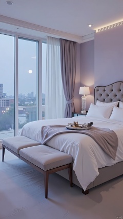 SNSJ, featuring a king-sized bed, tufted headboard, plush bedding, crystal sconces, a floor-to-ceiling window with sheer curtains, soft moonlight, calming lavender walls, luxurious fabrics, serene bedroom, peaceful nights, luxury boutique, tranquil retreat.