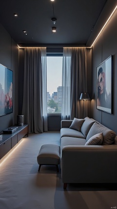 SNSJ, showcasing a home theater, luxury seating, surround sound system, modern art installations, a large window with blackout curtains, ambient lighting, deep velvet walls, sleek contours, sophisticated entertainment space, movie nights, luxury modern, immersive experience.