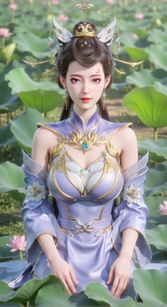 SFW,(masterpiece:1.2),best quality,absurdres,masterpiece,original,extremely detailed wallpaper,perfect lighting,1girl,solo,looking at viewer,(cowboy_shot:1.3),long hair,high heels,blurry background,depth of field,motion blur,(light cyan long dress:1.23),china_dress,chinese_style,bare shouders,crystal_earrings,headpiece,hair_tie,chest_jewel,gem,necklace,jewelry,in summer,day,outdoors,nature,garden,,(sitting,Lotus pond, lotus:1.59),(huge breasts:2.99),(full breasts:2.89),Xzhihua,Xsiyouyou,Xyanruyu,Xmoxiaonan,Xyeqingxian