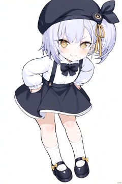 masterpiece,best quality,high quality,loli,chromatic aberration,fair_skin, Children, 1girl, solo, looking at viewer, smile, bangs, skirt, simple background, shirt, long sleeves, hat, white background, bow, ribbon, closed mouth, standing, full body, hair ribbon, yellow eyes, white shirt, grey hair, shoes, socks, puffy sleeves, collared shirt, virtual youtuber, black skirt, black footwear, side ponytail, v-shaped eyebrows, black headwear, black bow, beret, suspenders, white socks, mary janes, puffy long sleeves, hands on hips, suspender skirt