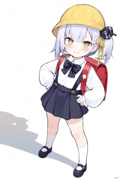 masterpiece,best quality,high quality,loli,chromatic aberration,fair_skin, Children, 1girl, solo, looking at viewer, blush, smile, short hair, bangs, skirt, simple background, shirt, hair ornament, long sleeves, hat, white background, bow, ribbon, full body, yellow eyes, white shirt, grey hair, shoes, socks, virtual youtuber, bowtie, black skirt, bag, side ponytail, backpack, suspenders, white socks, mary janes, hands on hips, suspender skirt, randoseru, yellow headwear, school hat