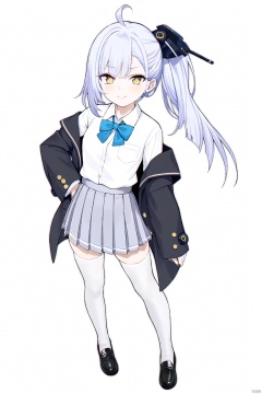masterpiece,best quality,high quality,chromatic aberration,fair_skin, 1girl, solo, long hair, looking at viewer, smile, bangs, skirt, simple background, shirt, hair ornament, thighhighs, long sleeves, white background, bow, closed mouth, school uniform, standing, jacket, full body, yellow eyes, white shirt, ahoge, pleated skirt, shoes, collared shirt, bowtie, off shoulder, nail polish, black footwear, side ponytail, white thighhighs, zettai ryouiki, black jacket, hand on hip, blazer, black nails, grey skirt, blue bowtie, shirt tucked in