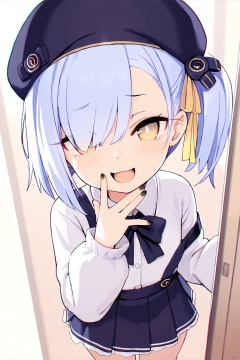 masterpiece,best quality,high quality,chromatic aberration,fair_skin,1girl, solo, looking at viewer, smile, open mouth, skirt, shirt, long sleeves, hat, ribbon, blue hair, yellow eyes, nail polish, hair over one eye, side ponytail, beret,loli