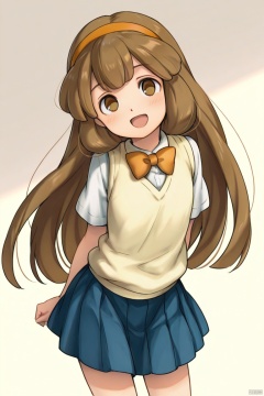 masterpiece, best quality, high quality, nanobana kinako \(Inazuma Eleven Go\), 1girl, solo, long hair, smile, open mouth, brown hair, brown eyes, school uniform, sweater vest, orange hairband, blue skirt,