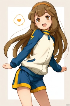 masterpiece, best quality, high quality, nanobana kinako \(Inazuma Eleven Go\), 1girl, solo, long hair, smile, open mouth, brown hair, brown eyes, shorts, track jacket, orange hairband,