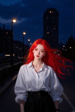 a vibrant red haired woman with long, wavy red hair stands in front of a dark backdrop of a cityscape. The woman's face is adorned with a white button-down long-sleeved blouse and a black skirt with a black belt tied around the waist. Her hair cascades over her shoulders, adding a pop of color to the scene. To the left of the woman, a black railing stretches across the street, adding depth to the composition. In the background, a tall building stands tall, illuminated by a few street lights. The sky is a deep blue, with a few wispy clouds streaming across it.