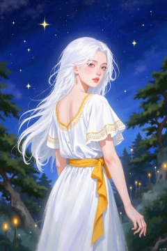 A medium-sized painting of a white woman with long white hair, wearing a white dress with a yellow sash around her waist. The woman's dress is adorned with orange accents, adding a pop of color to the scene. The background is a deep blue, with white stars scattered across the sky. There are trees in the bottom left corner of the frame, and trees on the bottom right corner.