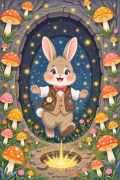 rabbit in a waistcoat and a pocket watch hopping down a rabbit hole. The hole is lined with glowing mushrooms, and there's a mysterious light at the bottom. The rabbit looks excited and a bit nervous.