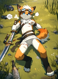 Solo,short hair,blue eyes,1 boy,animal ears,tail,whole body,male focus English text,goggles,dog ears,furry,head goggles,dog tail,toeless legs,furry male,white fur,animal nose,dog boy,orange fur,source furry,human,body hair,death,corpse,lying down,expressionless,whole body,limb weakness,limb extension,death,distant view,body hair,mouth slightly open,wear,no pupil,Lying flat,dead,rotting,killed by monsters,sword placed next to the body,stop breathing.white eye,green grassland,distant viewdistant viewdistant viewdistant viewdistant viewdistant viewdistant viewdistant view,<lora:电影工坊V3.0:0.44>,<lora:nayoshi01g:0.4>,<lora:细腻线条:0.35>,<lora:Expressive_H:0.3>,