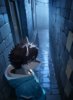 dark narrow alley,person standing,short dark hair,striped hoodie,dimly lit,blueish hue,raindrops falling,wet reflective walls,moody atmosphere,deep in thought,feeling melancholic,body fur,furry,negative hint,<lora:电影工坊V3.0:0.44>,<lora:nayoshi01g:0.4>,<lora:细腻线条:0.35>,<lora:Expressive_H:0.3>,<lora:Gondom_Style:0.6>,close-up,from_above,eyes_focus,depth of field,