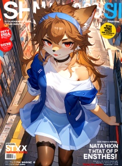 (8k, best quality, masterpiece),ultra-detailed,(high detailed skin),glossy skin,contrapposto,female focus,model,(hot:0.7),sexy,fine fabric emphasis,wall paper,crowds,fashion,Lipstick,depth of field,street,in public,Magazine cover,(title),(Magazine cover-style illustration of a fashionable woman),posing in front of a colorful and dynamic background. (The text on the cover should be bold and attention-grabbing, with the title of the magazine and a catchy headline),(hutaosl:1.2),blue jacket,blue skirt,white shirt,Black pantyhose,eyewear hang,red eyes,(long brown hair:1.1),blue hairband,off shoulder,open jacket,(good hands, nice hands:0.5),(beautiful_face),((intricate_detail)),((finely_detailed)),fine_fabric_emphasis,((glossy)),body fur,furry,<lora:nayoshi01g:0.4>,<lora:细腻线条:0.35>,<lora:Gondom_Style:0.3>,close-up,from_above,eyes_focus,depth of field,