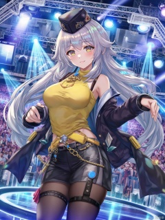 masterpiece,best quality,newest,absurdres,highres,safe1.1,1 woman,illustration,anime character,wears a sleeveless yellow top,and a black,military-style jacket over it,her outfit includes a cap labeled daft,and black thigh-high stockings with garters,she has a confident,sexy stance on a stage spotlighted by blue and white beams,creating a dynamic and glamorous atmosphere,Attractive light effects,torino