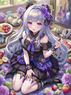 masterpiece,best quality,high quality,(colorful),loli,artist missile228, 1girl, flower, fruit, solo, dress, food, rose, fork, black dress, purple nails, long hair, tongue, tongue out, hair ornament, hair flower, looking at viewer, purple flower, gothic lolita, purple rose, knife, lolita fashion, apple, bracelet, sitting, breasts, nail polish, bare shoulders, planted, jewelry, grapes, eyepatch, grey hair, from above, wariza, black footwear, bow, off shoulder, pink eyes, hair bow, lace trim, purple eyes, off-shoulder dress, black flower, frills, cleavage, black bow,torino