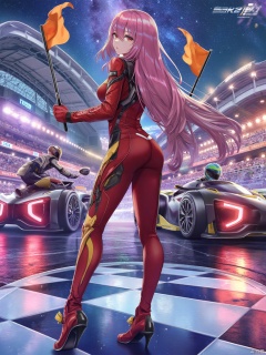 A futuristic racing scene with a female protagonist standing confidently in the foreground, her back to the viewer. She has long, flowing pink hair and wears a sleek, form-fitting racing outfit in shades of red and orange. She holds two flags, one in each hand, ready to signal the start of the race. The background features two advanced racing vehicles, one resembling a high-tech motorcycle on the left and the other a futuristic sports car on the right. Both vehicles have drivers wearing helmets and racing suits. The setting is a large, open space with a checkered floor, suggesting a starting grid. The overall color palette is vibrant, with a strong contrast between the dark night sky filled with stars and the bright lights emanating from the vehicles and the background. The lighting creates a dramatic atmosphere, highlighting the protagonist and the racing machines. The scene conveys a sense of anticipation and excitement, as if the race is about to begin.,torino