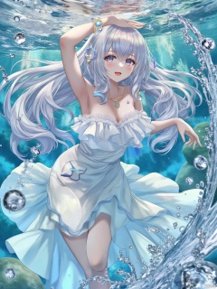 Create an image of a beautiful woman submerged underwater, embodying ethereal beauty. She has flowing, white hair that cascades around her, contrasting beautifully against a serene, pure blue background. The composition should focus on her solo figure, elegantly posed as she floats gracefully, exuding maturity and allure. Soft, dappled light filters through the water, illuminating her features and creating a dreamlike atmosphere. The color palette should be dominated by light blues and soft whites, enhancing the sense of tranquility. Use a hyper-realistic style, emphasizing the smooth texture of her skin and the fluidity of her hair. Capture a sense of gentle motion, as if she is softly swaying with the current. Aim for the highest quality, extremely clear resolution, resulting in a masterpiece that feels both captivating and serene,anime styl,torino