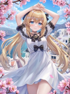An animated image of a white girl with long blonde hair and blue eyes. She is wearing a white dress with a black collar around her neck. Her dress is draped over her shoulders and she is holding her hands up in the air. There are pink flowers on the branches behind her. The background is a light blue sky,torino