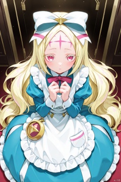 masterpiece, best quality, high quality, Morino Korisu \(I admire magical girls\), 1girl, solo, long hair, looking at viewer, blonde hair, hair bow, blue dress, white apron, pocket watch, forehead mark,