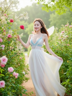 On a spring day, the garden looks like a dreamy scroll, with a beautiful woman in it. She was wearing a snow-white dress with a swaying hem like a lily. The lace and light blue ribbon outlined her slender waist. Walking in the sea of flowers, there are blooming flowers at your feet, your long hair is hanging down and brushing your cheeks, your eyes are clear and lively, and the corners of your eyes are raised to tell stories. Reaching out to touch the rose, her slender and pink fingers complemented the flower. The petals were like dewdrops. The woman leaned over to smell the fragrance and smiled, her dimples concealing sweetness. Butterflies danced around her, and she stopped. Her eyes were full of tenderness, and the sunlight shone through the leaves. She was like a fairy left behind, so beautiful and moving.