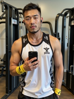 The handsome Asian man is in a gym, with fitness equipment behind him. He has short hair, well-defined facial features, and stubble on his cheeks and chin. He is wearing earbuds in his ears. Dressed in a black-and-white sports **** top with eye-catching black patterns and text logos, he looks full of vitality. He holds a mobile phone in his left hand, with yellow finger sleeves on his fingers, and his right hand is in his pocket. His posture is casual and confident, presenting an image of someone who loves fitness and is full of energy.<lora:Flux-FS-EP11:0.7>, <lora:F.1-DETAILER_V1.0:0.5>