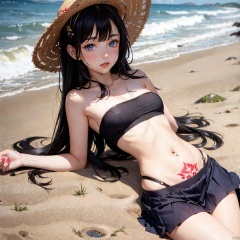 A 10-years-old little whore, with long wavy black hair and blunt bangs, wearing a strapless crop top., (she is wearing a straw hat, and displaying a tattoo on her abdomen just below her navel—a design known as "abdomentattoo1."), Her blue eyes look directly at the viewer., Her lips are red from lipstick., shot with depth, dutch angle,depth of field, She has healthy body and flat stomach., She wears a pleated skirt and enjoys the outdoors., She sits on the sandy beach in the dead of night by the seaside, captured in a Polaroid photo, .,Her figure illuminated faintly by the moonlight., The image has a soft and nostalgic glow that adds to its vintage appeal.,