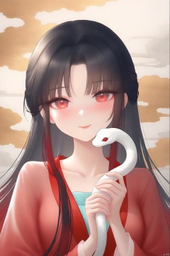 ,jinboyancaizhushahong,1girl, solo, looking at viewer, blush, smile, long hair, bangs, hanfu, holding snake, collarbone, upper body,multicolored hair, hands up, gradient hair, smoke,