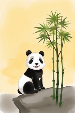 , Jinboyancaizhushahong,a panda is perched on a rock, its head turned slightly to the left. The panda's body is a stark white, with a black stripe down its back. Its eyes are a piercing black, and its nose is a darker shade of black. To the right of the panda, a tall bamboo plant is visible, its branches reaching up to the sky. The background is a muted yellow, and the plant's leaves are a vibrant green, adding a pop of color to the scene.
