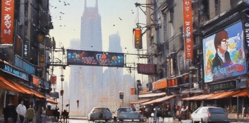 A futuristic cityscape , with sleek skyscrapers and neon-lit streets. A sprawling metropolis with towering vertical farms, hovering drones, and self-driving cars zipping by. In the foreground, gazing up at a massive LED display projecting holographic advertisements and public art.80-degree viewing angle
