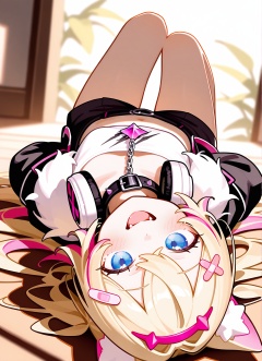 BREAK mococo abyssgard,1girl,:3,animal ears,bandaid hair ornament,black collar,black jacket,blonde hair,blue eyes,fangs,fur trim,headphones around neck,looking at viewer,multicolored hair,open mouth,pink hair,pink hairband,smile,white shirt,x hair ornament,cropped shirt,cropped jacket,arms behind back,bare foot,feet focus,lying,feet out of frame,, masterpiece,best quality,amazing quality,very aesthetic,high resolution,ultra-detailed,absurdres,scenery,depth of field,(tianliang duohe fangdongye:2)