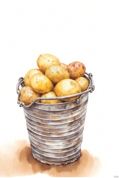 a silver metal bucket is filled with potatoes. The potatoes are a vibrant shade of brown
