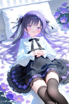 eperouge(maimai),1girl, solo, long hair, looking at viewer, blush, smile, open mouth, bangs, shirt, thighhighs, long sleeves, ribbon, jewelry, very long hair, purple eyes, hair ribbon, white shirt, purple hair, flower, :d, earrings, lying, frills, collared shirt, black thighhighs, on back, two side up, sleeves past wrists, pillow, petals, dress shirt, black ribbon, feet out of frame, on bed, purple flower