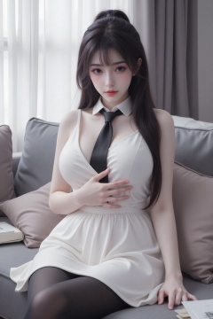 1girl, solo, long hair, breasts, looking at viewer, bangs, skirt, large breasts, black hair, dress, bare shoulders, brown eyes, sitting, closed mouth, ponytail, pantyhose, necktie, sleeveless, indoors, white dress, lips, pillow, black pantyhose, window, curtains, couch, cushion, carpet,Chest opening,