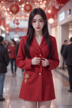 In the middle of a crowded shopping mall, a girl with pale skin and long, straight black hair stands out. She wears a red coat with ornate gold patterns, and her thighs are visible as she poses with both hands holding a red ribbon. The high-resolution image captures the best quality of her skin, with a glowing subsurface scattering effect. The camera is placed at a slight angle to capture her full body, with the background filled with red decorations and blooming lights. The halatio effect adds a touch of magic to the scene, making it a true masterpiece.