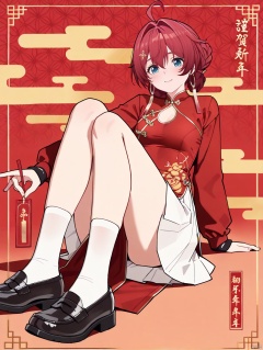 masterpiece,best quality,newest,absurdres,highres,very awa, danjin, danjin\(wuthering waves\), 1girl, long chinese dress, long sleeves, white socks, white skirt, braid buns, earrings, smile, chinese new year, black loafer,