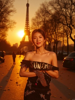 Here is a prompt for creating an exquisitely detailed image based on your description: A cinematic shot taken on the iconic Champs Elysées in Paris at dusk in autumn, as the sun dips below the horizon casting a warm glow (film grain: 1.2). A stunning Chinese woman, wearing a strapless low-cut long dress with intricate details and natural skin texture, stands out against the majestic Eiffel Tower's backdrop. Her radiant smile illuminates her deep cleavage, highlighting her plump breasts, as she proudly displays the bust of her dress featuring bold golden letters 'SUNSHINE'. The fallen leaves on the ground glisten with a warm golden light, reflecting the vibrant colors of the setting sun. Captured using Fujifilm XT3, in 4K resolution, this unity 8k wallpaper boasts ultra-detailed skin texture and finely detailed facial features, showcasing an exquisitely realistic masterpiece.