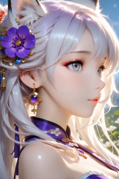 Masterpiece,best quality,ultra-detailed,detailed pupils,photography,high quality,top CG rendering,highest quality,ultra-clear,ultra-detailed,Official Art,Extremely Detailed CG,8k Wallpapers,HD,game CG,1girl,animal_ears,bare_shoulders,cat_ears,earrings,eyelashes,face,flower,fox_ears,grey_eyes,hair_flower,hair_ornament,jewelry,long_hair,portrait,profile,purple_flower,solo,white_hair