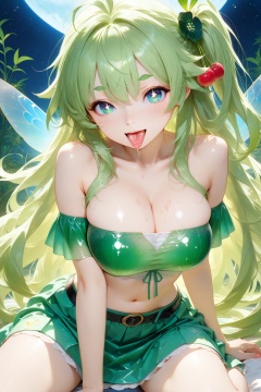 Masterpiece,best quality,ultra-detailed,detailed pupils,high quality,top CG rendering,highest quality,ultra-clear,ultra-detailed,Official Art,Extremely Detailed CG,8k Wallpapers,good figure,HD,game CG,Spit out her tongue, Fairy Gushe has willow eyebrows and starry eyes, a Yao nose and a cherry mouth, and a skin like gelatin. Her hair is messy and her hair is horizontal, her skirt is half untied, her big breasts are trembling slightly under her bellyband, and her silky tube top is extremely alluring.