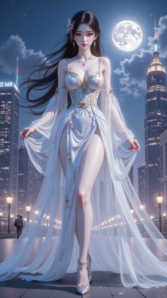plns,hlr,hlr_dress,This is a CG - style illustration depicting a female character adorned in magnificent clothing. She has long, jet - black hair and a delicate face. Her attire features a metallic sheen and is decorated with exquisite patterns, paired with transparent floating veils, embodying a combination of classic and modern elements. The background is a bustling city night scene, with a bright moon hanging high in the sky, creating a dreamy and romantic atmosphere., standing,full body, looking at viewer, CG
