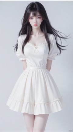 [Artist:wlop],masterpiece,best quality,solo,1girl,stading,full body,delicate face,arms behind back,black_hair,vely long hair,blunt_bangs,floating hair,looking_at_viewer,blue eyes,beautiful detailed eyes,white_frilled_dress,white pantyhose, puffy sleeves,skirt pleats,rose,delicate details,plns