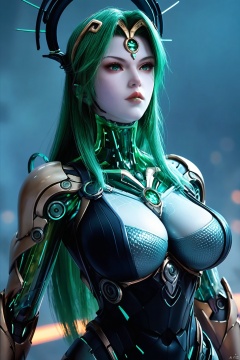 score_9,score_8_up,score_7_up,PYH,1girl, solo, long hair, breasts, large breasts, weapon, green hair, lips, colored skin, science fiction, joints, forehead jewel