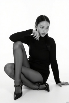 A black and white photograph of a woman in a black turtleneck sitting on a white surface. The woman is wearing black high heels with black straps on them. Her hair is pulled back in a ponytail and she is looking to the right side of the frame. Her eyes are a piercing blue and her lips are pursed. Her right hand is resting on her hip. The backdrop is a stark white wall.