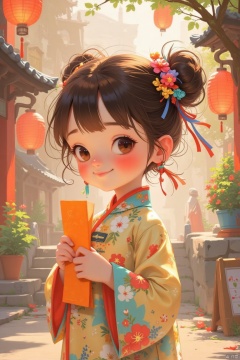 1girl, solo, blush, smile, bangs, black hair, hair ornament, long sleeves, ribbon, holding, brown eyes, hair ribbon, upper body, braid, flower, outdoors, parted lips, hair flower, hair bun,  holding an orange scroll .chinese clothes, floral print, tassel, child, hair rings, lantern, stairs, branch, architecture, east asian architecture, paper lantern