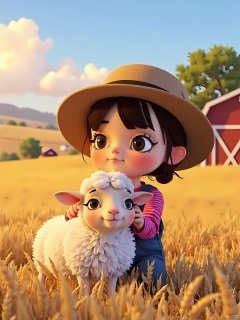 A digital page from a children's book about farm life. A little farmer girl pets a fluffy sheep, both surrounded by a barn and fields of golden wheat. The sheep's eyes are soft and content, positioned near the bottom of the frame. The background fades into a distant landscape of rolling hills, emphasizing the simplicity of farm life. The aesthetic is rustic, with earthy tones and charming details. It fuses digital illustration with a farm-themed setting.,guanghui,color trace,