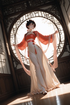 masterpiece,best quality,amazing quality,very aesthetic,absurdres,newest,chinese_new_year,a lively street,hanfu,chinese clothing,china_dress,long_skirt,extreme aesthetic,in the style of fashion photography,light particles,cinematic lighting,Visual impact,sharp focus,Emotionalization,depth of field,scenery,dynamic pose,dutch angle,dance movements,slender build,