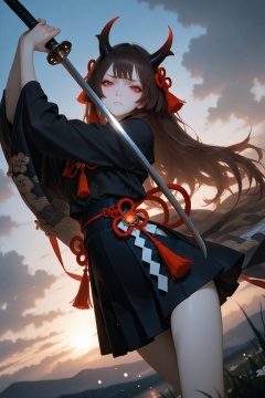 masterpiece,best quality,amazing quality,very aesthetic,absurdres,newest,extreme aesthetic,in the style of fashion photography,light particles,cinematic lighting,Visual impact,sharp focus,Emotionalization,depth of field,dutch angle,scenery,1girl, black shirt, black skirt, brown hair, closed mouth, cloud, demon horns, flower knot, frown, holding, holding sword, holding weapon, horns, katana, long hair, looking at viewer, mole, mole under eye, onmyoji, red eyes, red ribbon, ribbon, seigaiha, shide, sword, tassel, dynamic pose,