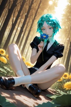masterpiece,best quality,amazing quality,very aesthetic,absurdres,newest,extreme aesthetic,in the style of fashion photography,light particles,cinematic lighting,Visual impact,sharp focus,Emotionalization,depth of field,dutch angle,scenery,highres,phosphophyllite,gem uniform \(houseki no kuni\),solo,extremely exquisite female facial description,eye reflection,colorful,detailed light,light leaks,sunlight,shine,bokeh,blurry foreground,ray tracing,lens flare,cinematic lighting,sunflower,spider lily,blue flower,(realistic:0.8),foreshortening,outdoors,sitting,forest,lotus position,indian style,shoes,holding flower,