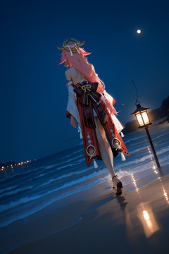masterpiece,best quality,amazing quality,very aesthetic,absurdres,newest,extreme aesthetic,in the style of fashion photography,light particles,cinematic lighting,Visual impact,sharp focus,Emotionalization,depth of field,dutch angle,scenery,night,realistic,dim light,dark,yae miko,scenery,from behind,lantern,beach,waves,walking,crescent,