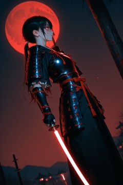 masterpiece,best quality,amazing quality,very aesthetic,absurdres,newest,extreme aesthetic,in the style of fashion photography,light particles,cinematic lighting,Visual impact,sharp focus,Emotionalization,depth of field,dutch angle,scenery,1girl,solo,long_hair,black_hair,gloves,red_eyes,holding,closed_mouth,standing,ponytail,weapon,outdoors,sky,japanese_clothes,black_gloves,sword,fingerless_gloves,holding_weapon,armor,from_side,torn_clothes,profile,blood,night,glowing,scar,holding_sword,moon,katana,shoulder_armor,full_moon,pauldrons,blood_on_face,japanese_armor,arm_guards,red_theme,blood_on_weapon,glowing_weapon,red_moon,energy_sword,red_sky,glowing_sword,huge_moon,lightsaber,